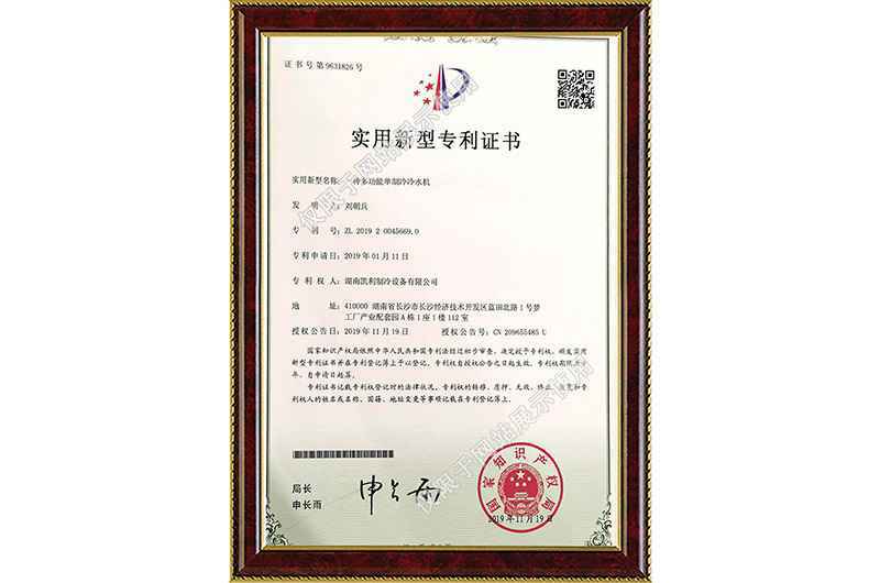 多功能单制冷冷水机专利证书